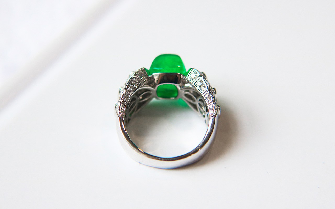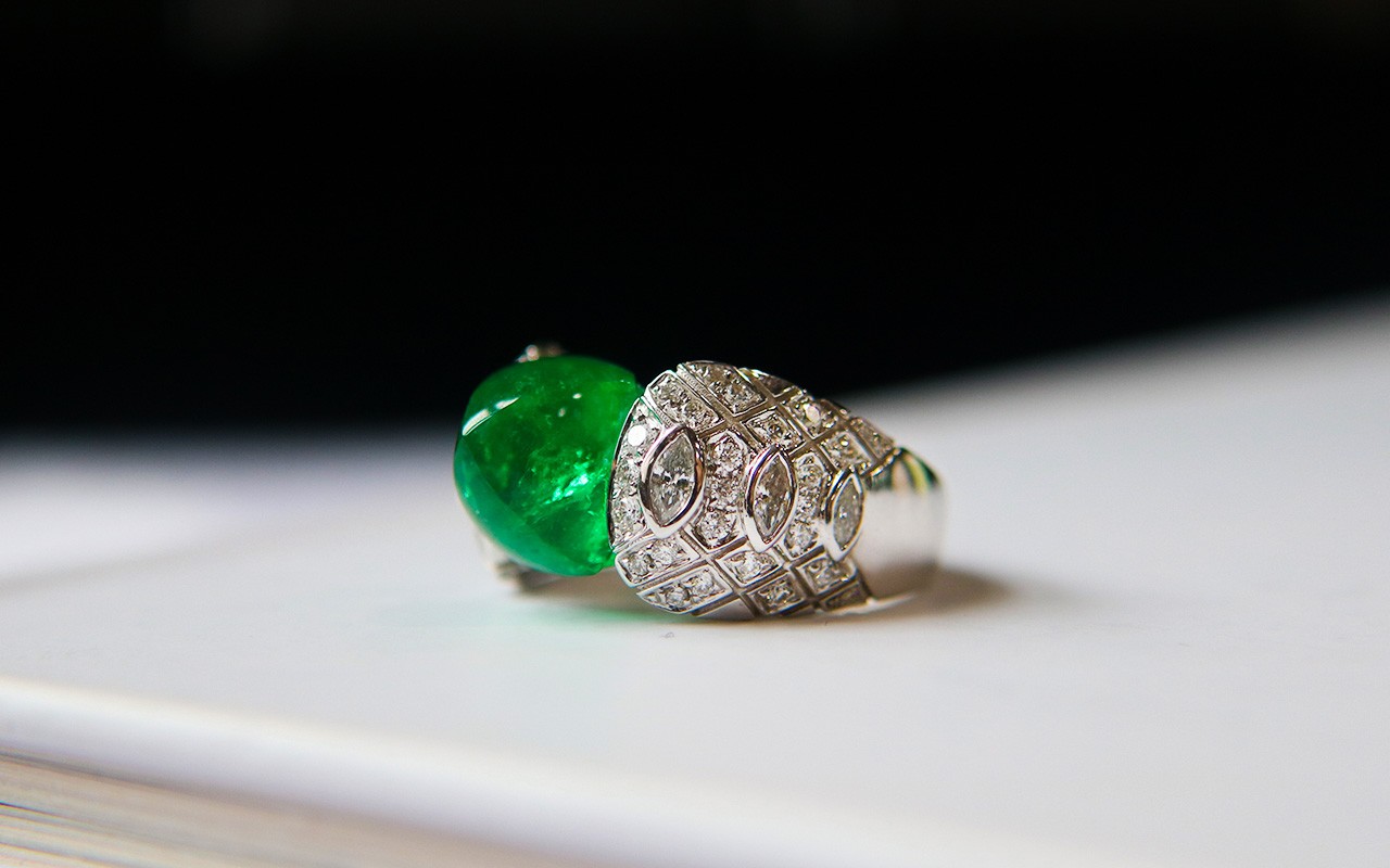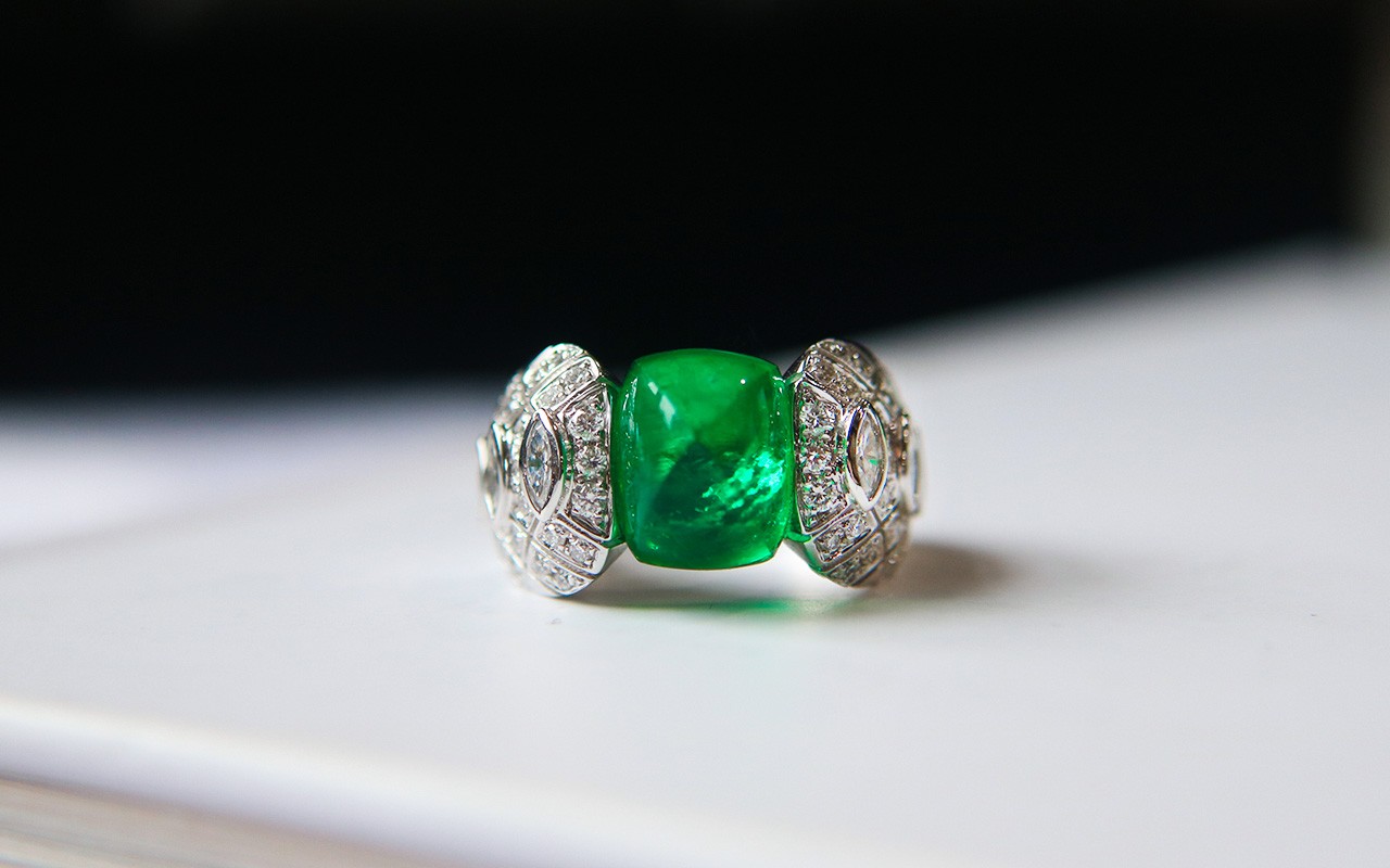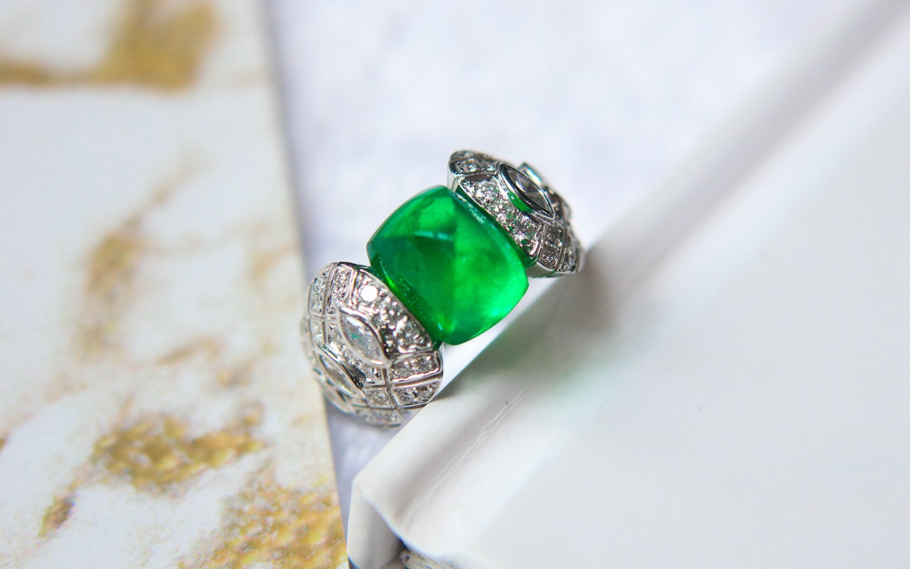 比起常见的刻面祖母绿,糖面包山祖母绿虽然舍弃了耀眼的火彩,但是将晶莹剔透的晶体更加突出。从另一个角度来看,晶体内部被完全暴露在人眼前,对宝石本身的品质要求是极高的,意味着它必须无瑕且高净。